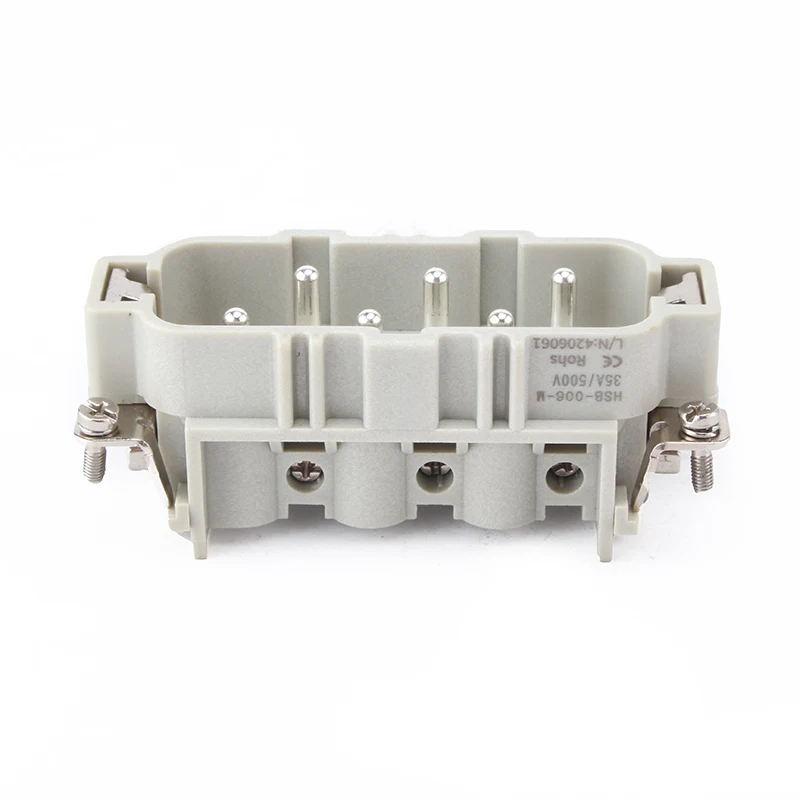 Ang HSB-006-M HSB Heavy duty connector ay gumagana sa ilalim ng 35A current .35A 6 Pin Insert Heavy Duty Connector ay 6 na pin o dobleng 12 pin para makipag-ugnayan sa mga wire. Nag-aalok ito para sa iba't ibang mga kondisyon sa pagtatrabaho, at sikat na ginagamit sa mga awtomatikong industriya at mga uri ng koneksyon ng mga kable ng makina.