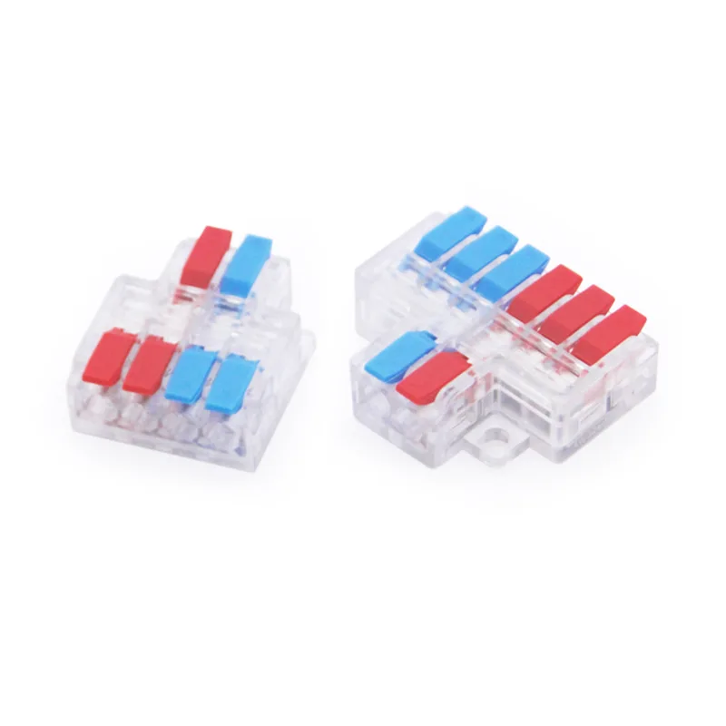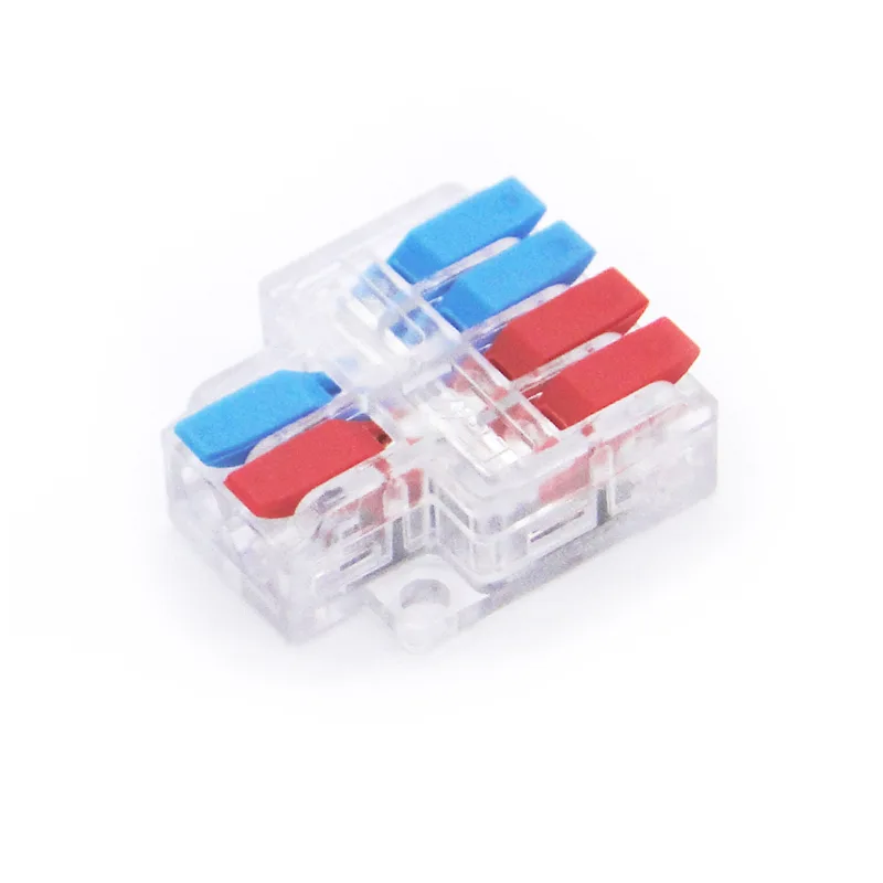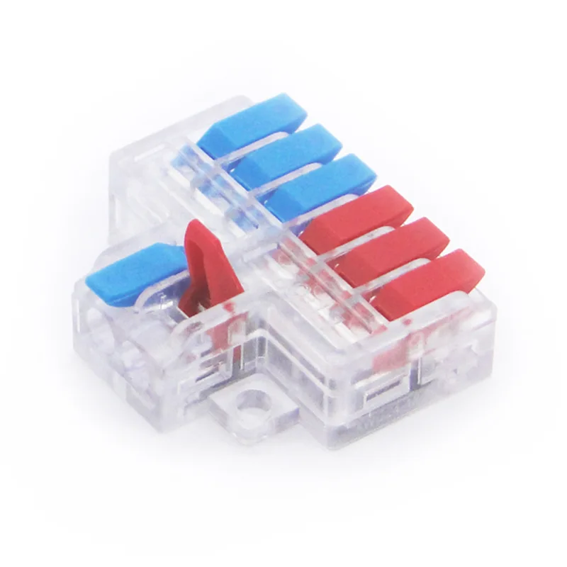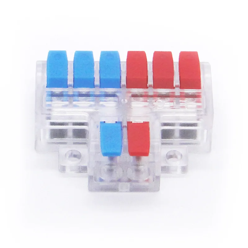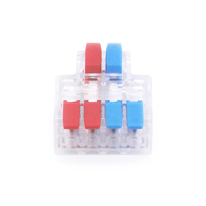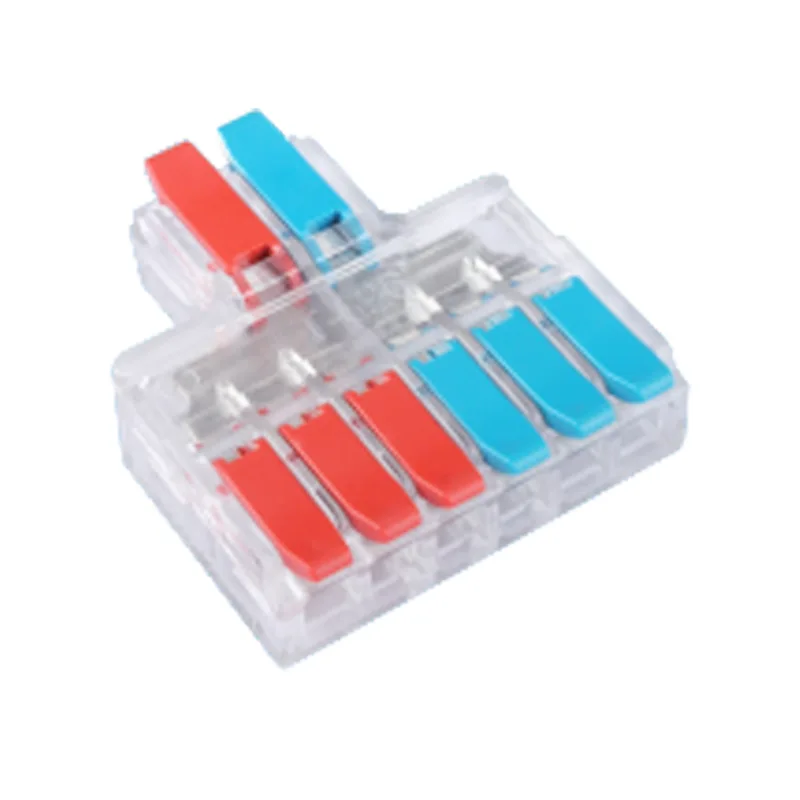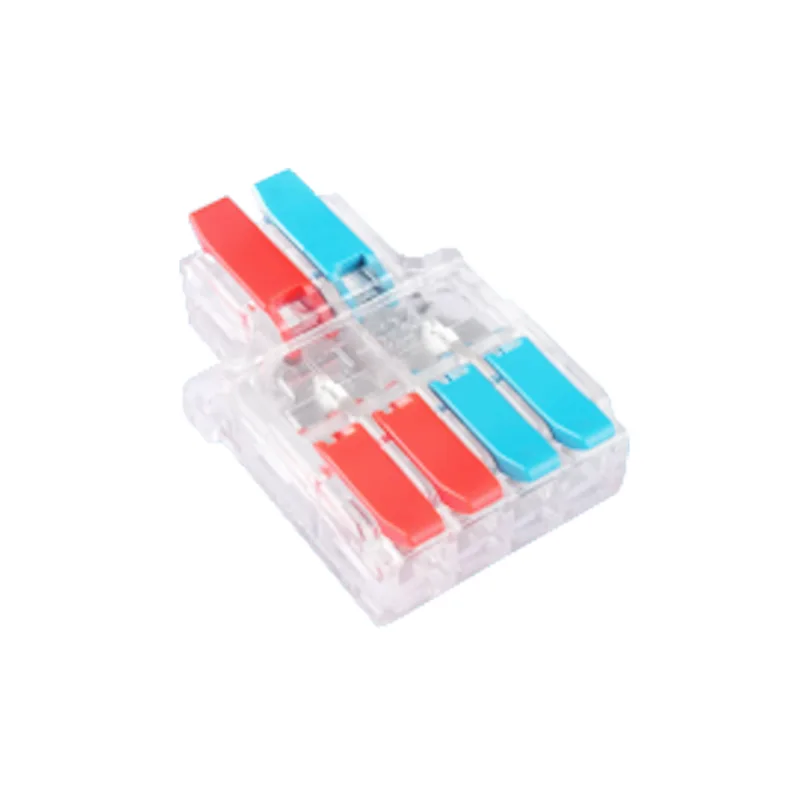 Ang two-in Four-out splicing wire quick connectors ay idinisenyo para sa mga malalaking-gauge na cable, na sumusuporta sa mga koneksyon hanggang sa 6 square millimeters. Kakayanin nito ang mga agos ng hanggang 35 amperes. Gumagamit sila ng mga hawakan ng iba't ibang kulay upang malinaw na makilala ang mga ruta ng mga kable.