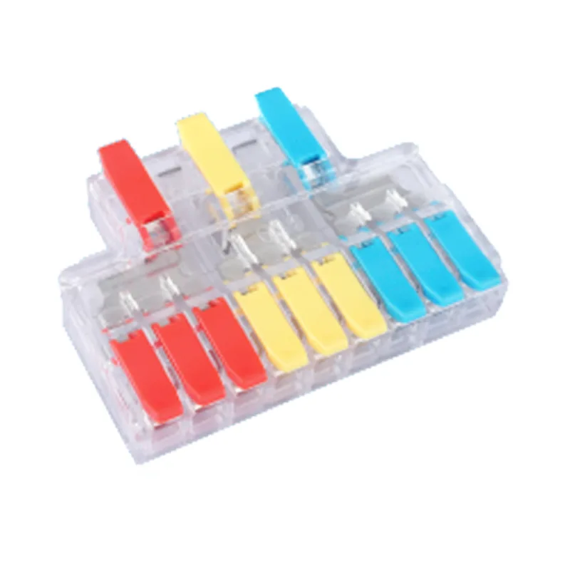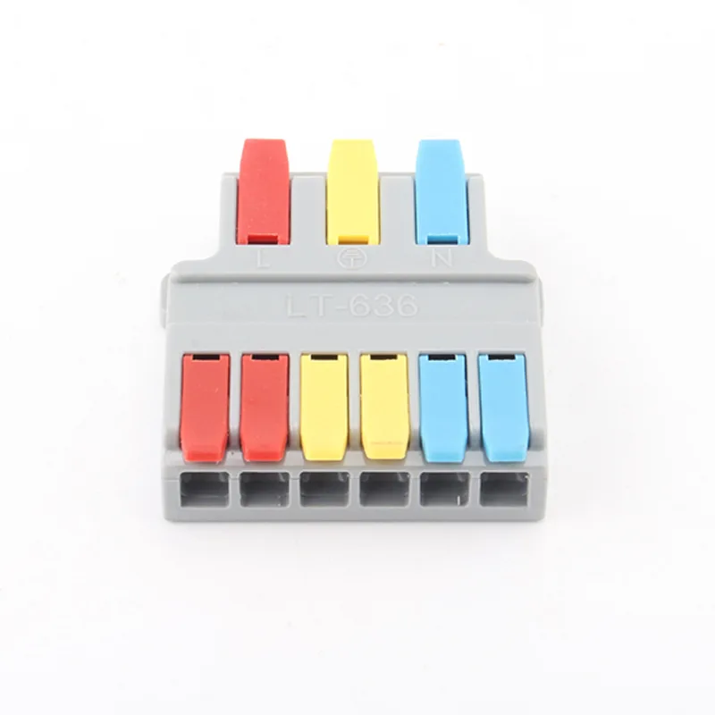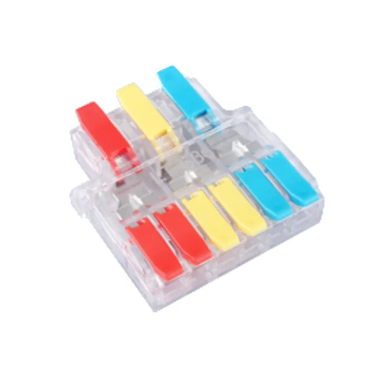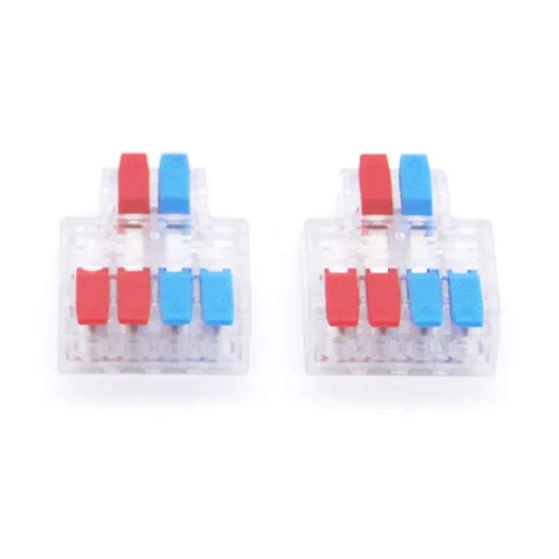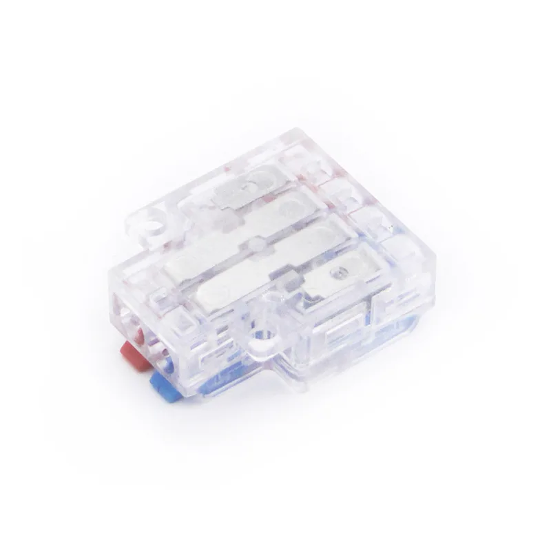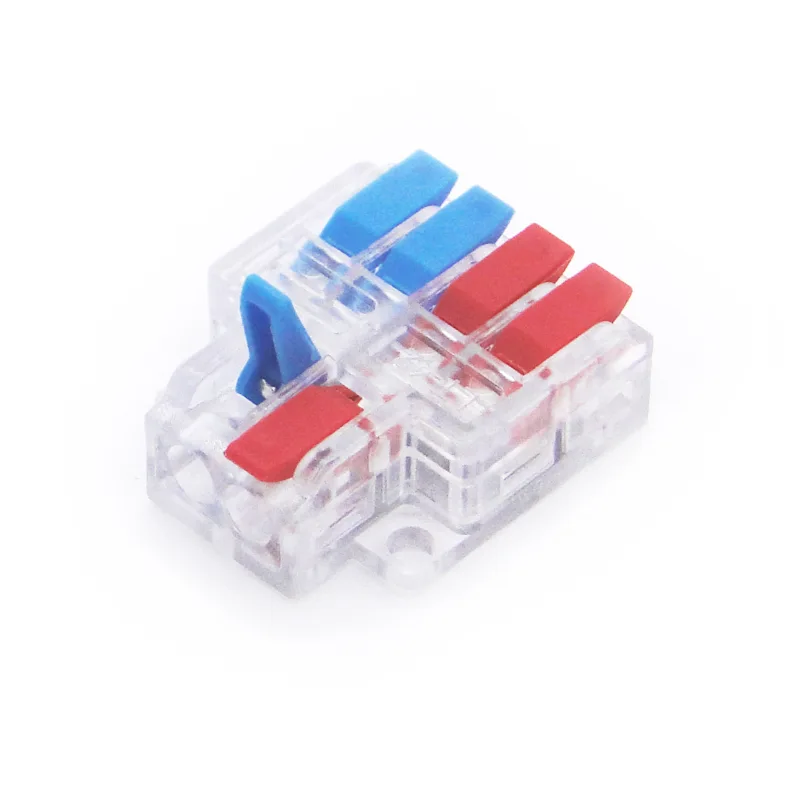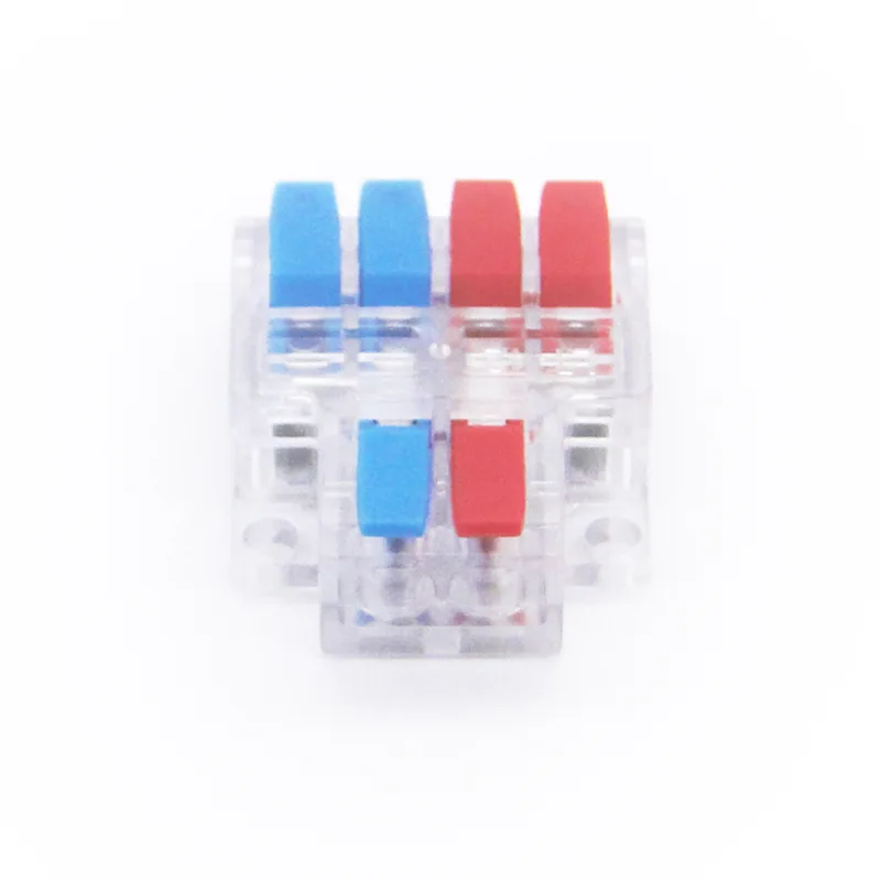 Ang two-in Four-out splicing wire quick connectors ay idinisenyo para sa mga malalaking-gauge na cable, na sumusuporta sa mga koneksyon hanggang sa 6 square millimeters. Kakayanin nito ang mga agos ng hanggang 35 amperes. Gumagamit sila ng mga hawakan ng iba't ibang kulay upang malinaw na makilala ang mga ruta ng mga kable.